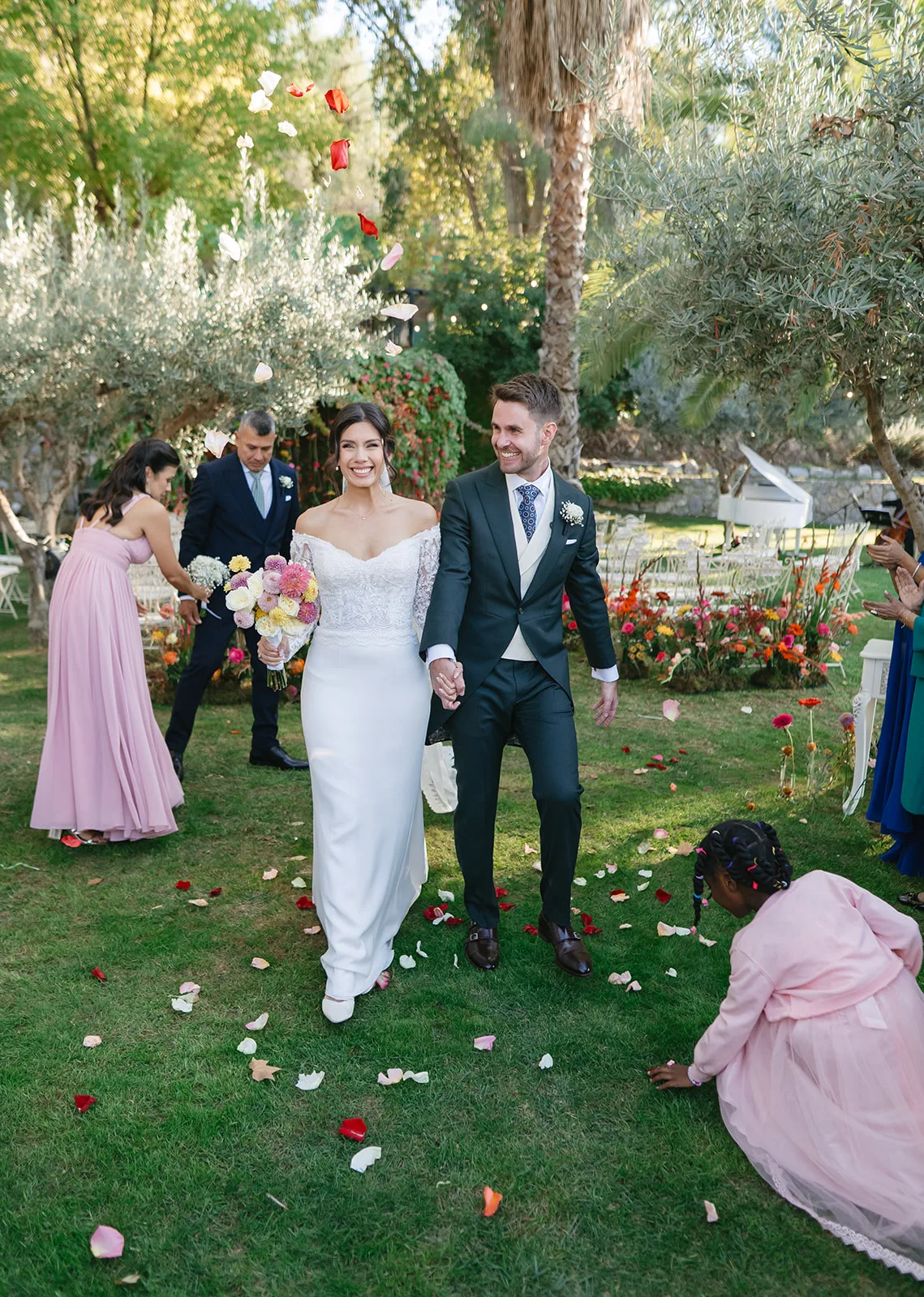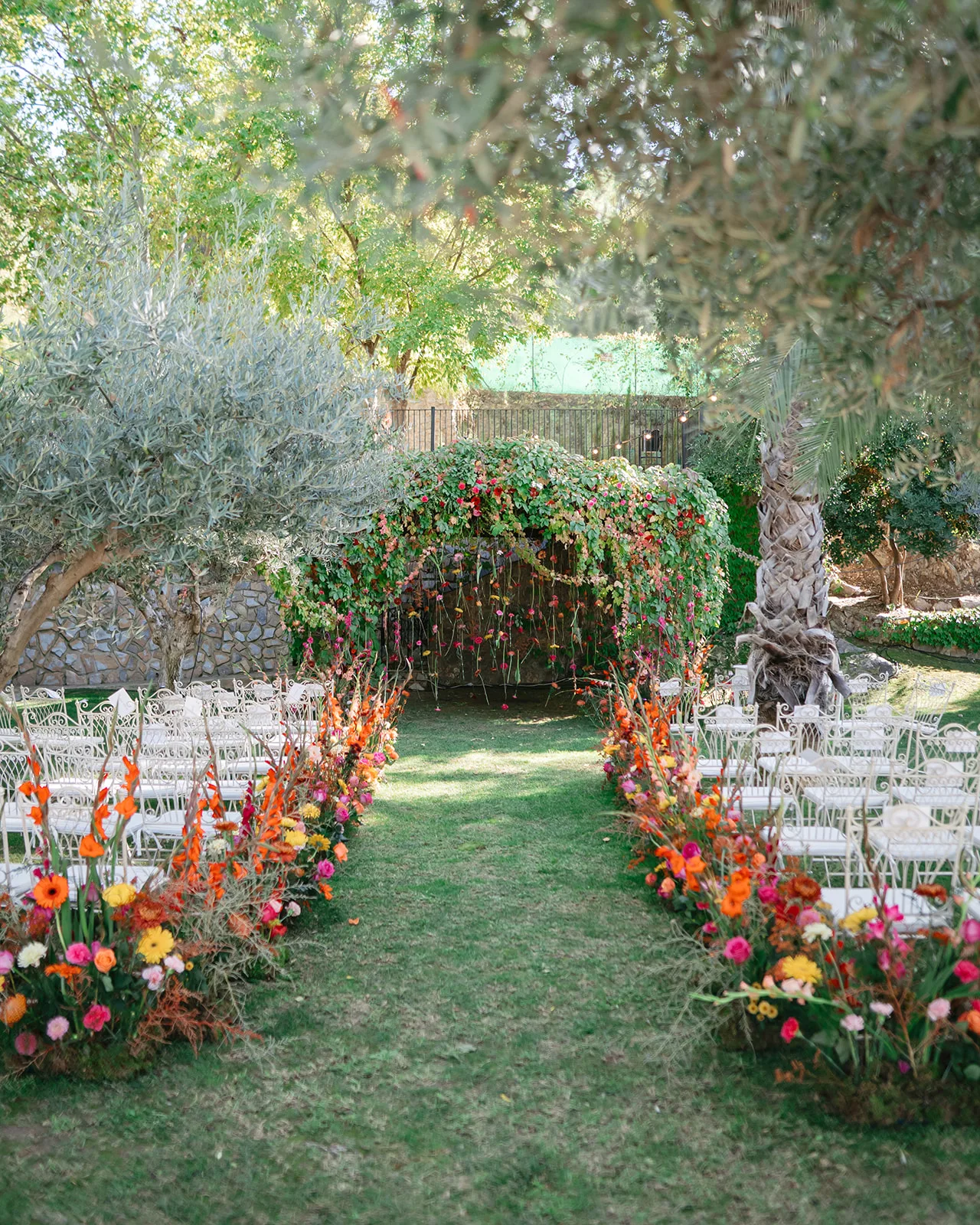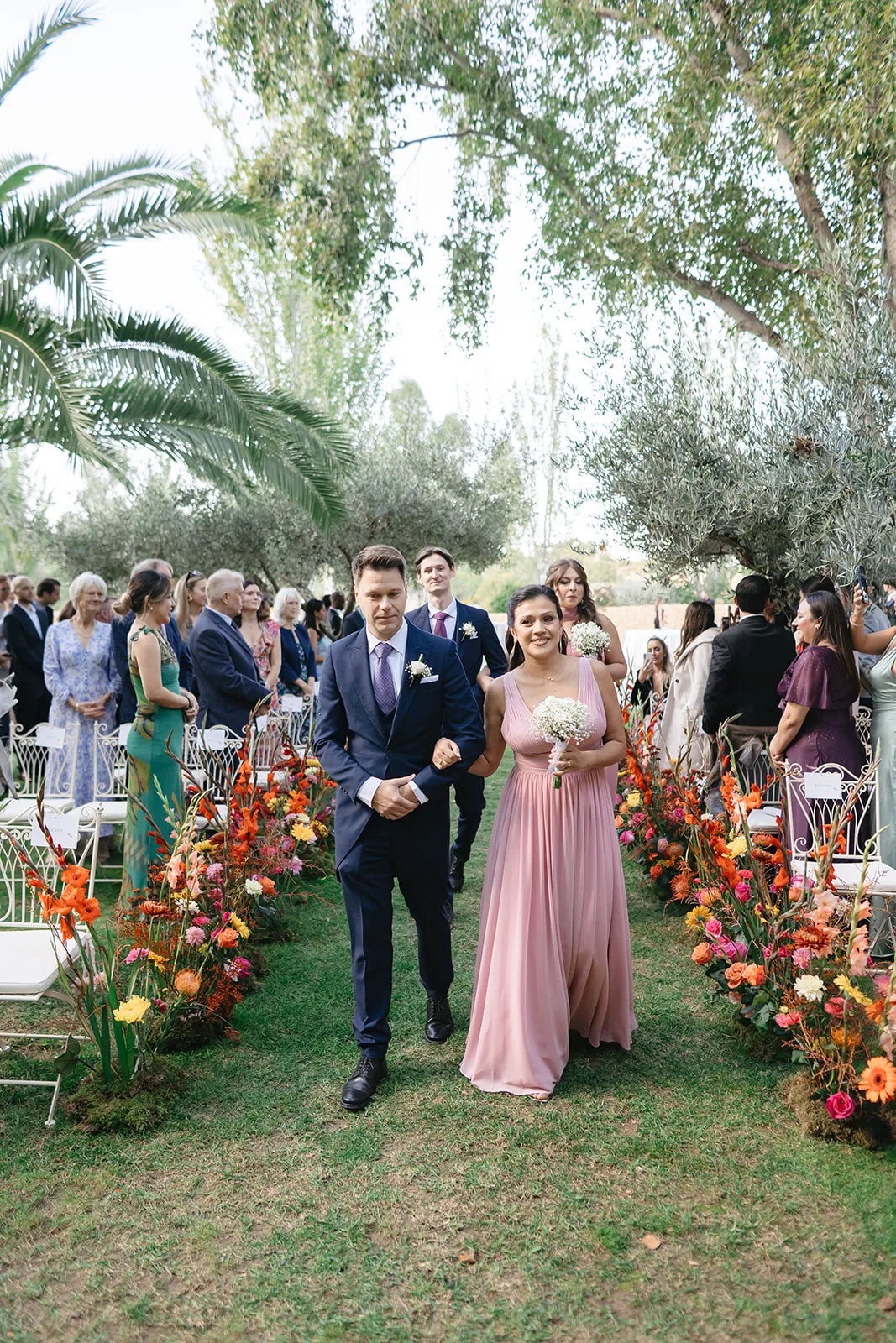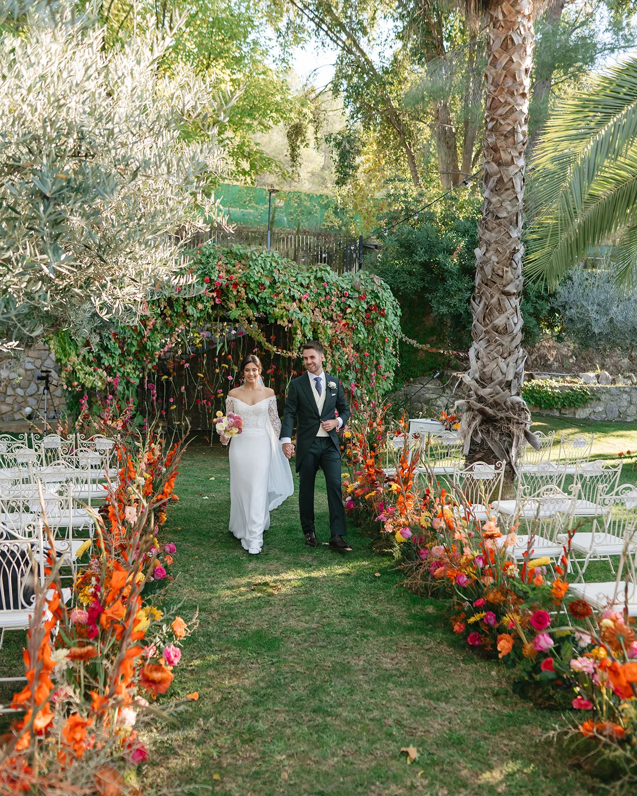 La ceremonia, rodeada de naturaleza, fue profundamente emotiva. Un piano de semicola acompañaba cada momento, mientras los invitados, llegados desde distintos puntos del mundo, se dejaban llevar por la sensibilidad del instante. El pasillo, enmarcado por una florística salvaje y colorista, llevado a la realidad por el gran equipo de Bésame Mucho, guiaba hacia un altar que parecía surgir de la propia vegetación de un cuento de hadas.