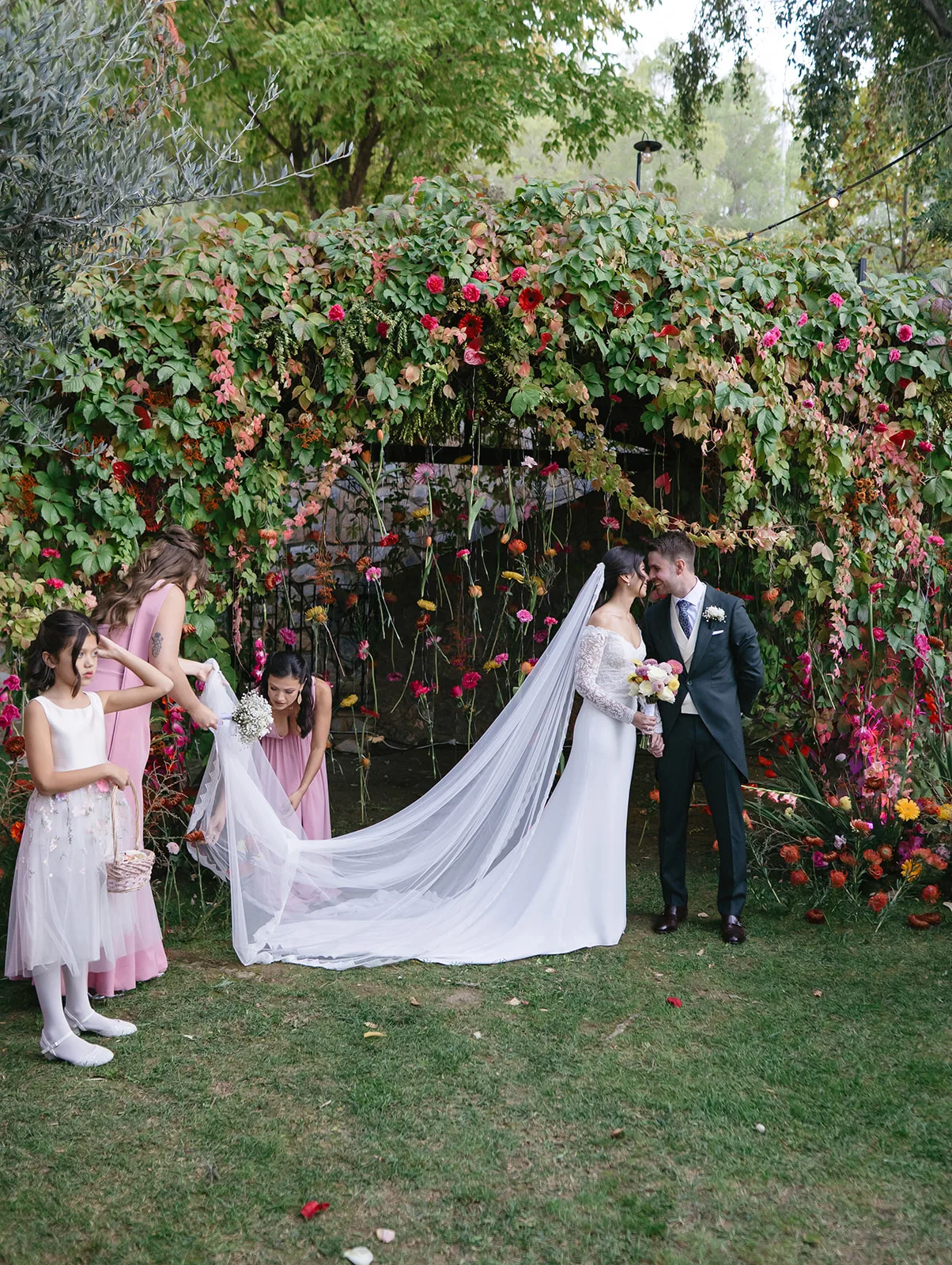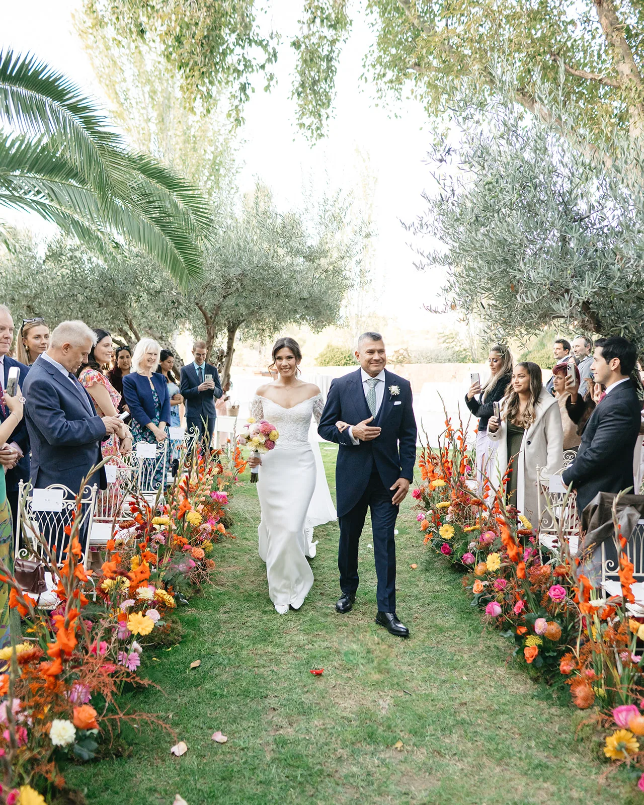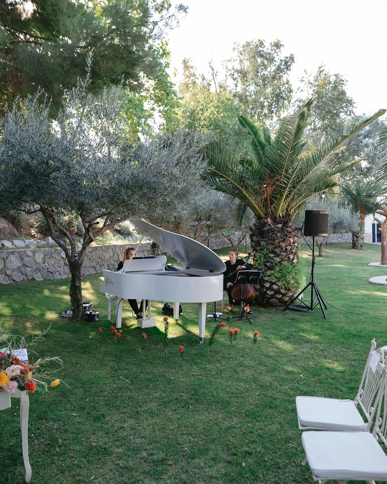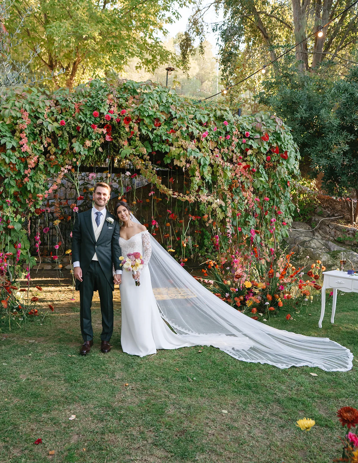 La ceremonia, rodeada de naturaleza, fue profundamente emotiva. Un piano de semicola acompañaba cada momento, mientras los invitados, llegados desde distintos puntos del mundo, se dejaban llevar por la sensibilidad del instante. El pasillo, enmarcado por una florística salvaje y colorista, llevado a la realidad por el gran equipo de Bésame Mucho, guiaba hacia un altar que parecía surgir de la propia vegetación de un cuento de hadas.