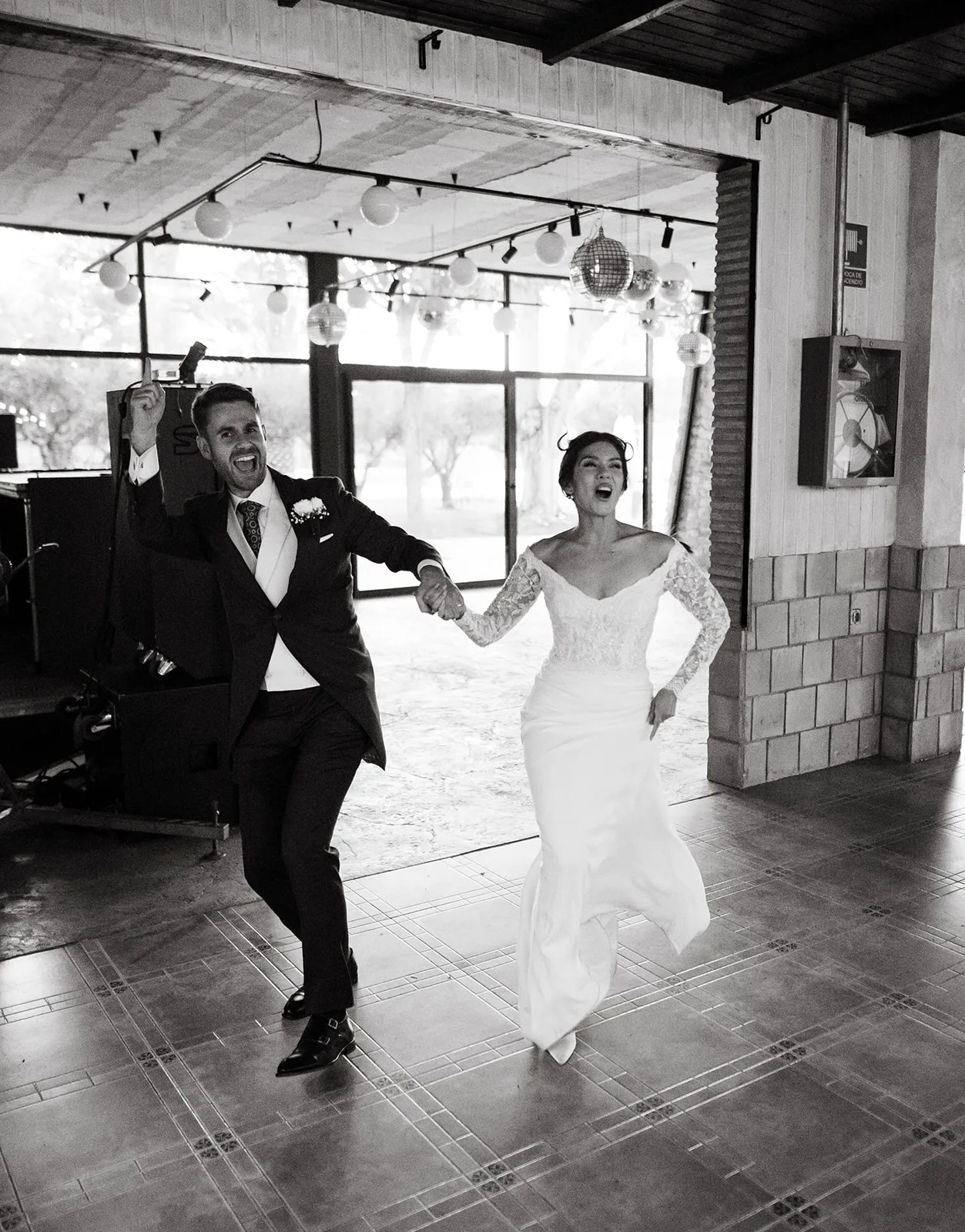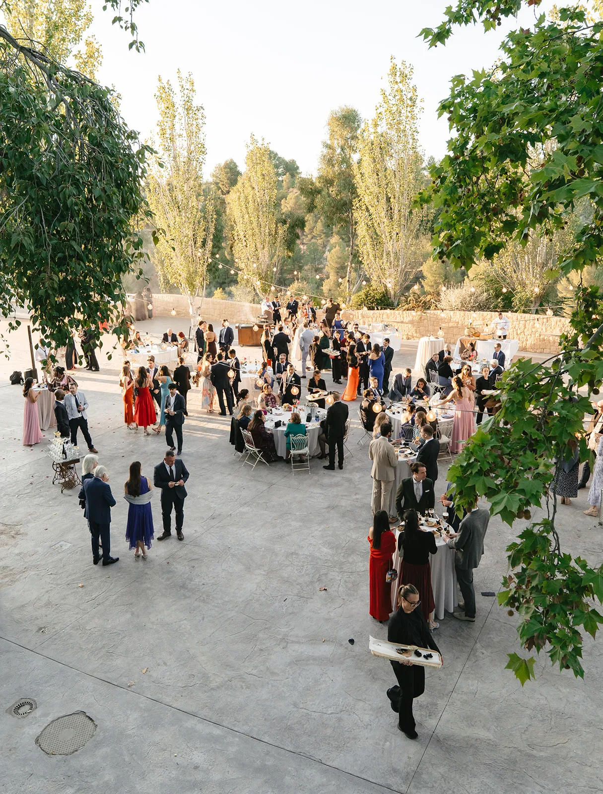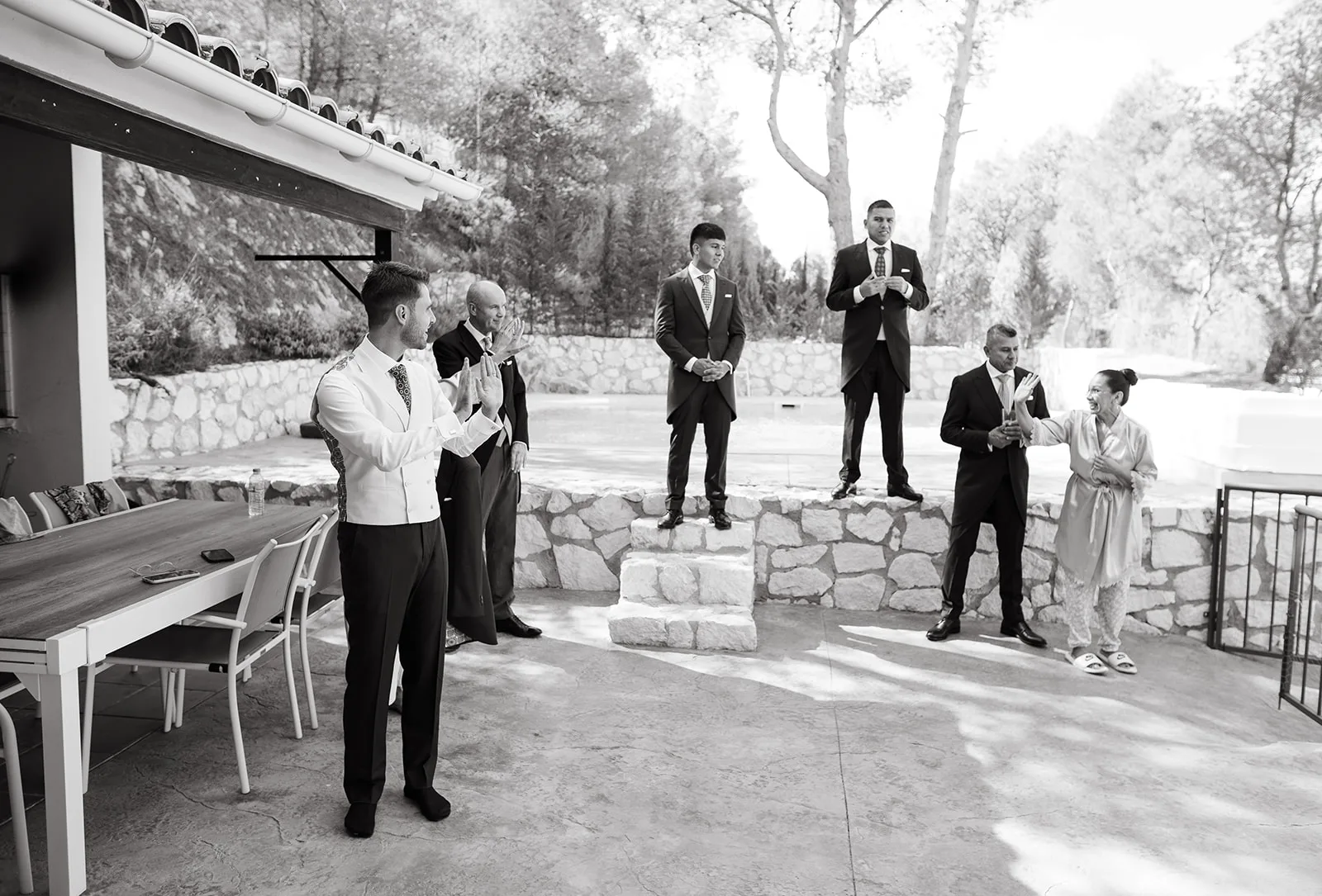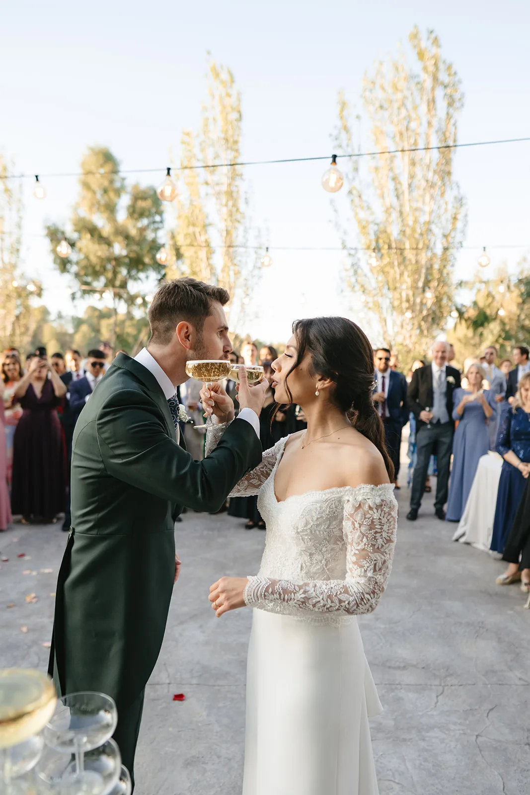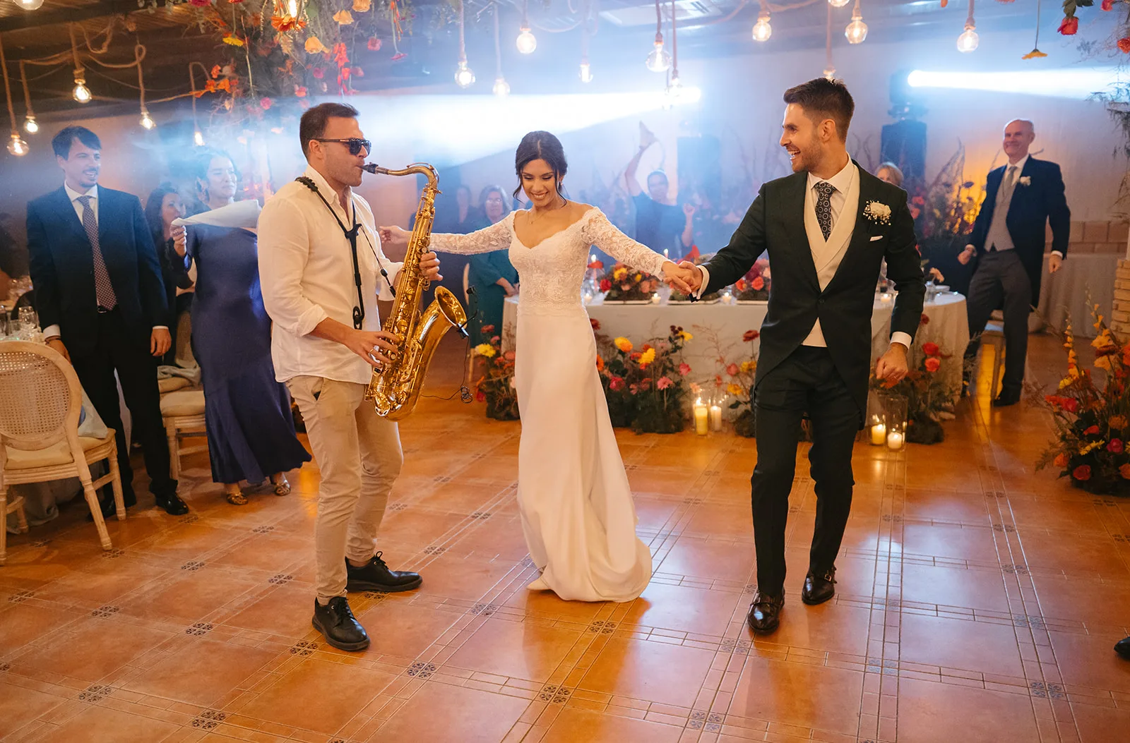 Tras el “sí, quiero”, el cóctel tomó un giro inesperado. El sonido de un saxo en directo rompía la calma y convertía el momento en algo mucho más vivo, casi improvisado. Los invitados no tardaron en dejarse llevar, bailando entre copas y risas, anticipando lo que estaba por venir.