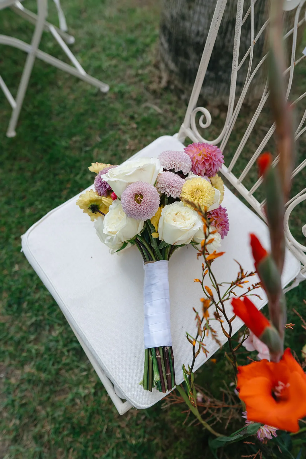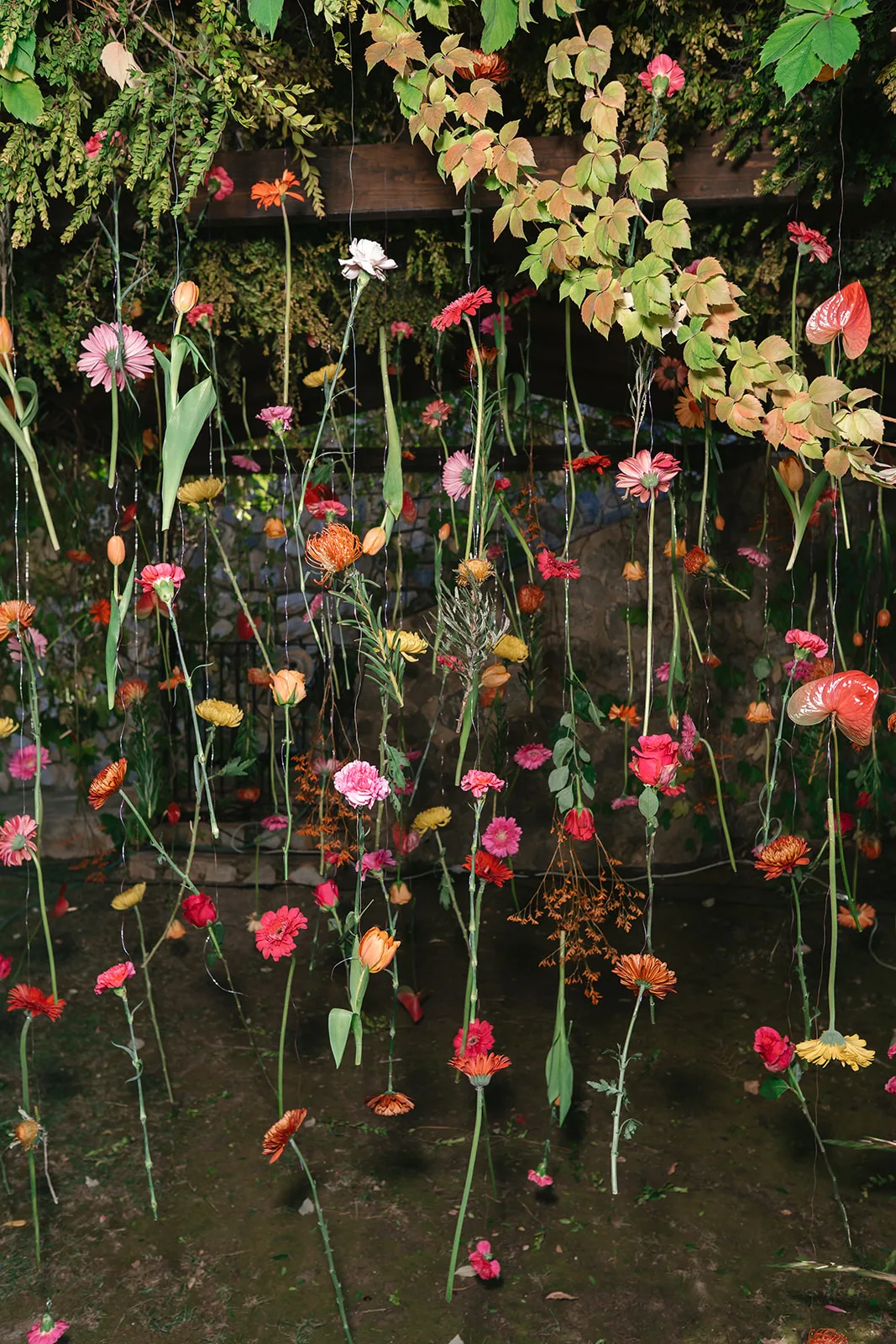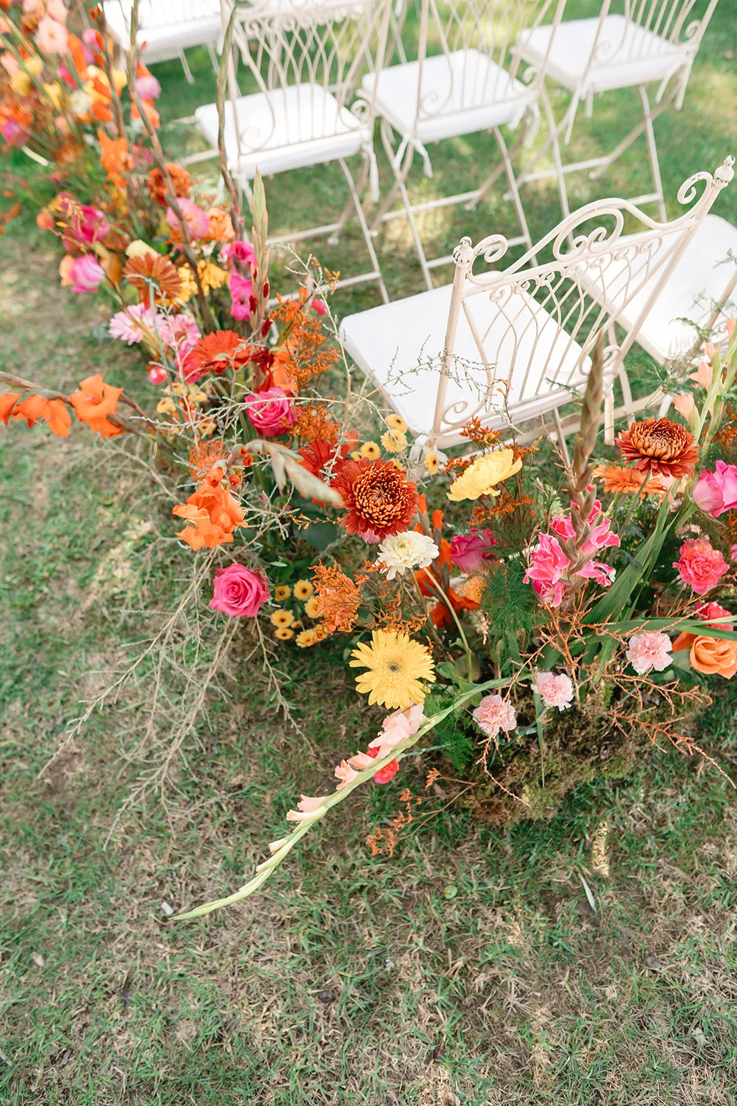 Desde el principio, lo tuvimos claro. Esta no iba a ser una boda neutra. La paleta cromática nació de ellos mismos, de su forma de ser, de esa capacidad de llenar cualquier espacio de vida. Naranjas, rosas, amarillos y rojos se entrelazaban en una propuesta vibrante, orgánica y absolutamente intencionada, que transformó la finca Entre Molinos en un escenario lleno de carácter.