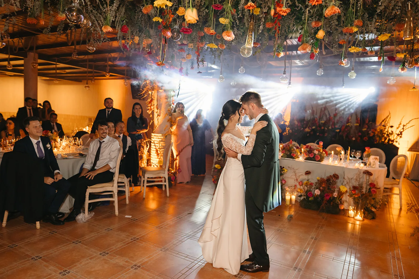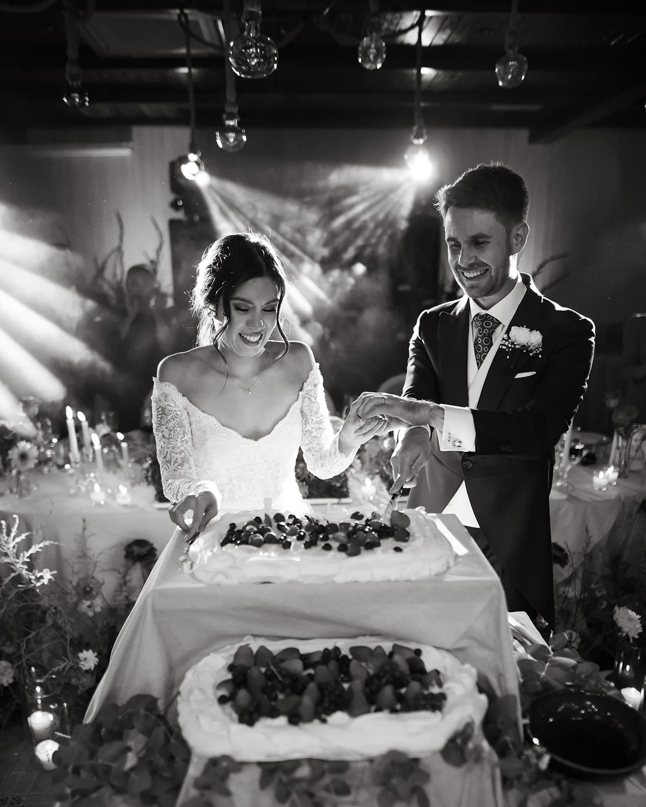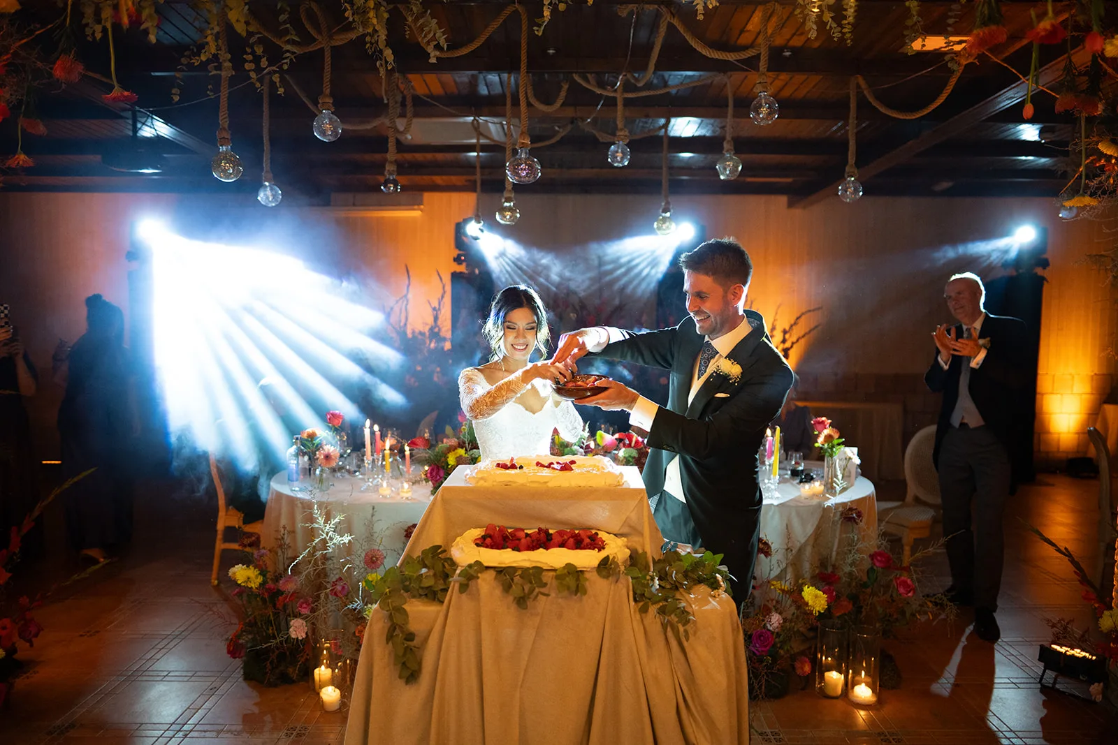 El banquete fue mucho más que una cena: fue una auténtica puesta en escena. El espacio se transformó en un escenario vivo, donde la iluminación, el humo y el diseño sensorial acompañaban cada momento clave. La entrada de los novios, el corte de la tarta o el primer baile se vivieron como auténticos momentos escénicos, donde la iluminación, el humo y la puesta en escena se alineaban para emocionar y sorprender.