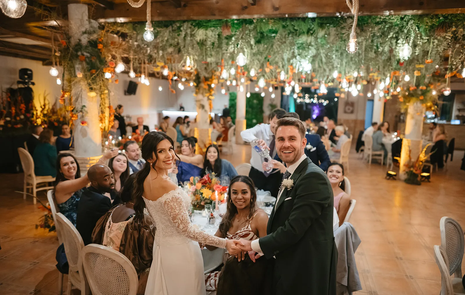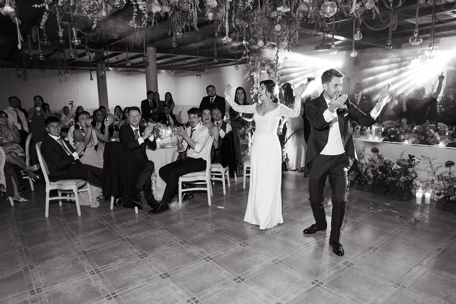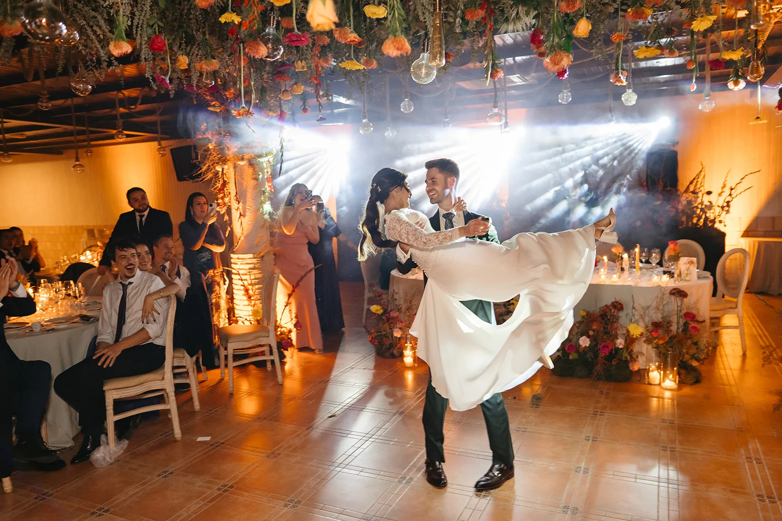 El banquete fue mucho más que una cena: fue una auténtica puesta en escena. El espacio se transformó en un escenario vivo, donde la iluminación, el humo y el diseño sensorial acompañaban cada momento clave. La entrada de los novios, el corte de la tarta o el primer baile se vivieron como auténticos momentos escénicos, donde la iluminación, el humo y la puesta en escena se alineaban para emocionar y sorprender.