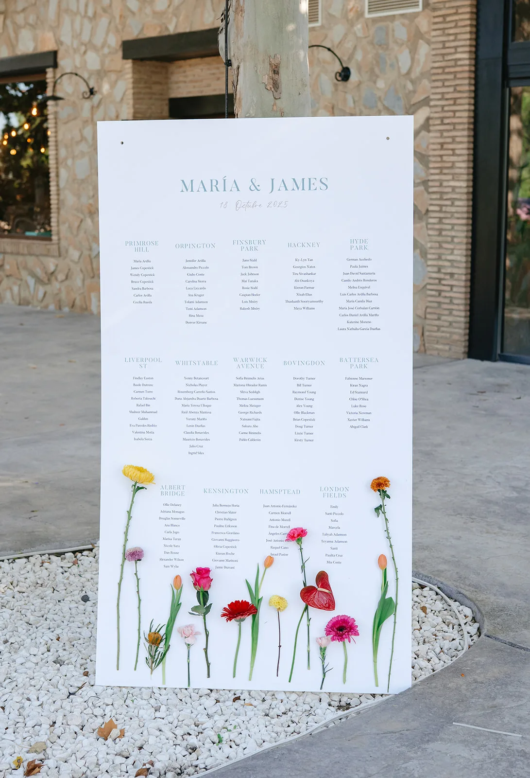 María estaba espectacular, con un look que reflejaba a la perfección su esencia: natural, luminosa y elegante. Su vestido, de Rosa Clará, combinaba romanticismo y sofisticación con una caída impecable. El maquillaje, de la mano de Consuelo Ortís, y la peluquería, realizada por Seicafun, completaban una imagen delicada y atemporal. James, por su parte, apostó por un traje de Sleeves & Co. y detalles personalizados
