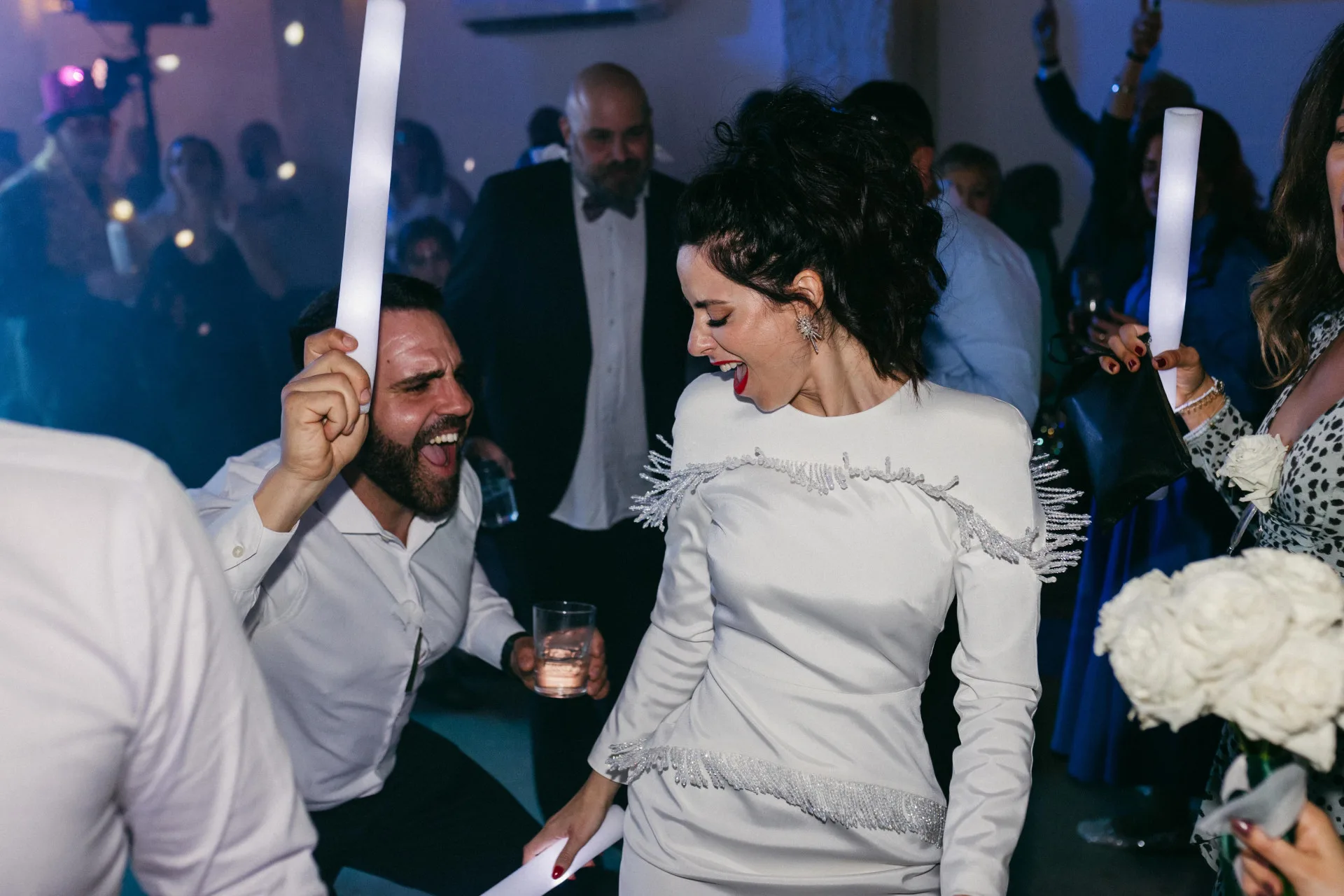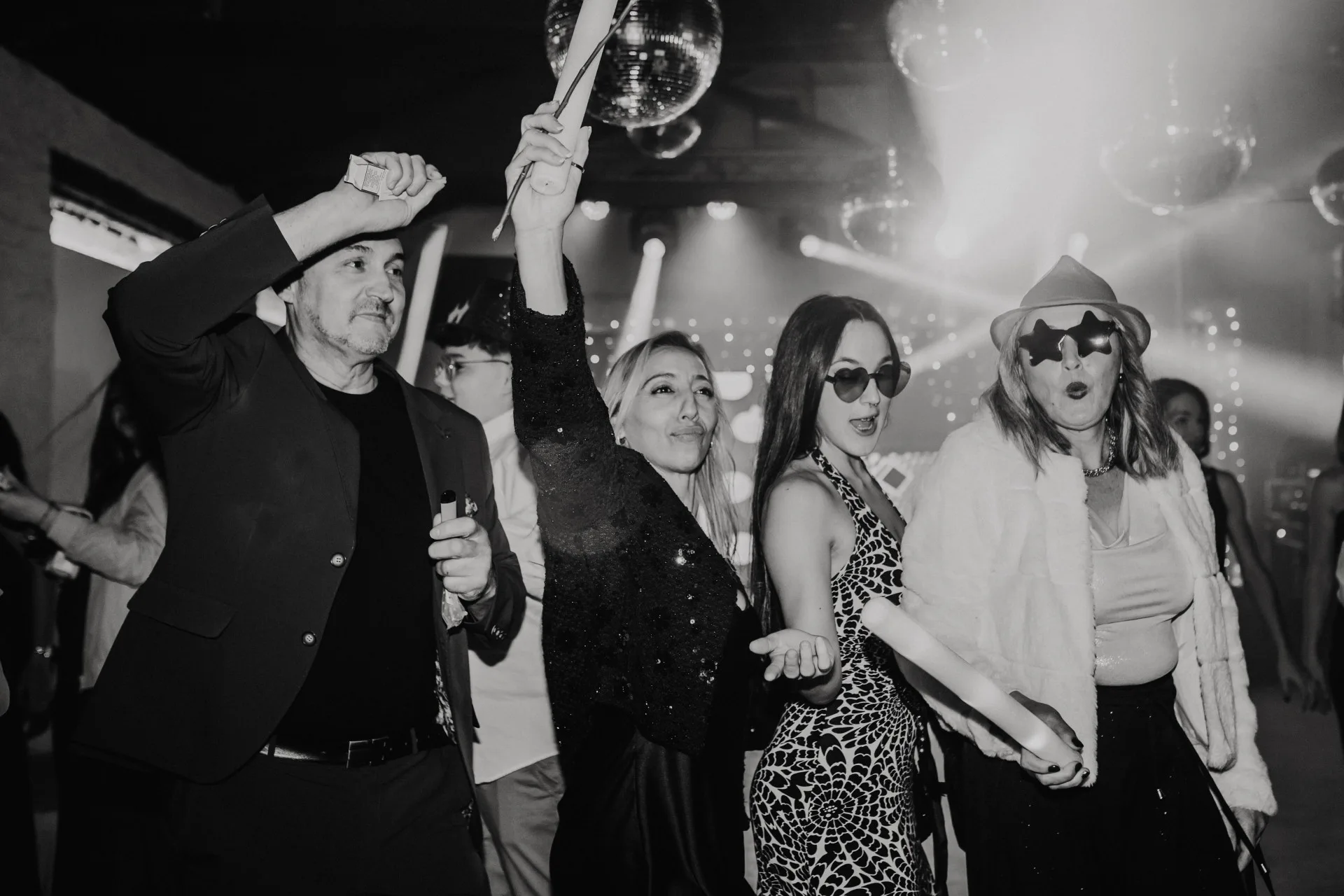 Y luego llegó la fiesta: una iluminación muy cuidada, escenario, bolas de disco y una energía imparable. Ana sorprendió a todos con un cambio de look radical: nuevo vestido, nuevos zapatos y un peinado muy “modo fiesta” que su equipo de Seicafun le hizo en tiempo récord. Tener a tus estilistas contigo en la boda… ¡no tiene precio!