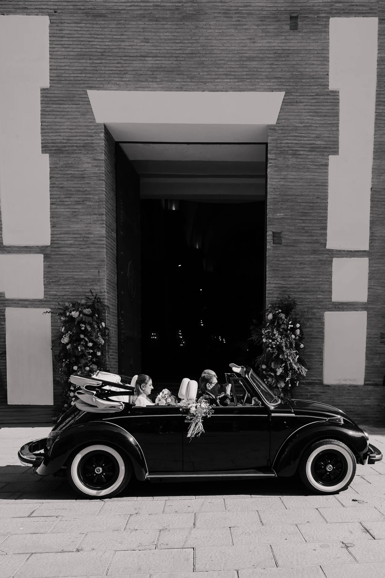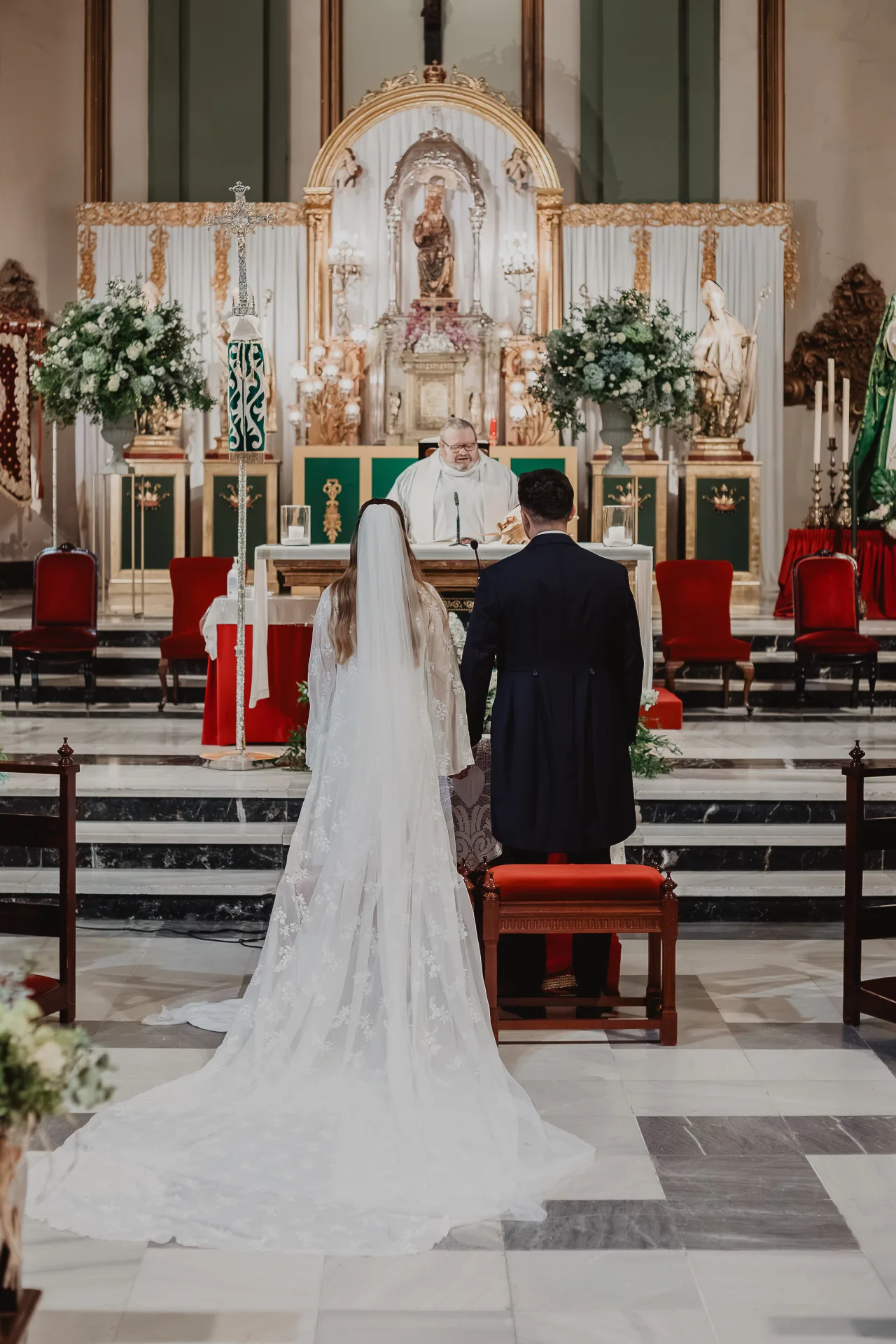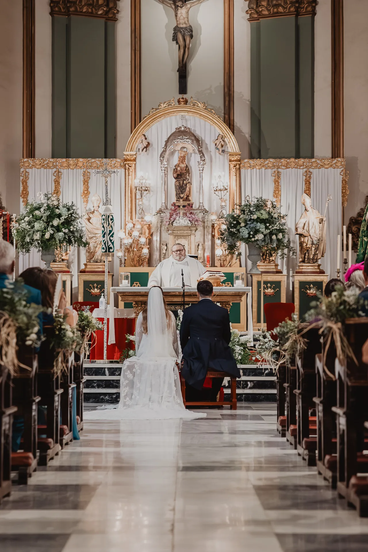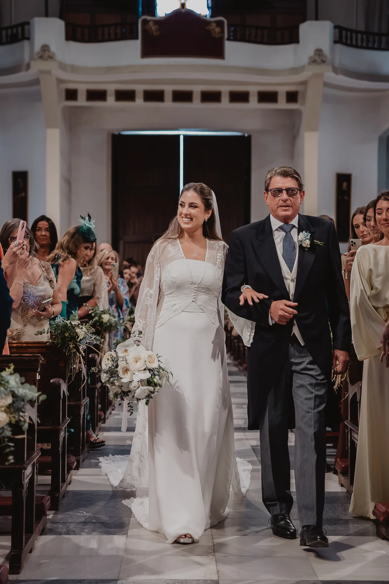 Ella, con un diseño a medida de Paula del Vals, zapatos de Pedro Miralles y el pelo suelto peinado por Eva Clara, irradiaba frescura y naturalidad. Como detalle especial, fue la propia Manuela quien se maquilló, algo poco habitual pero que refleja muy bien su estilo: una novia con mucha personalidad. Llegó a la iglesia en un coche antiguo, mientras sonaba música en directo de Musical Mastia.