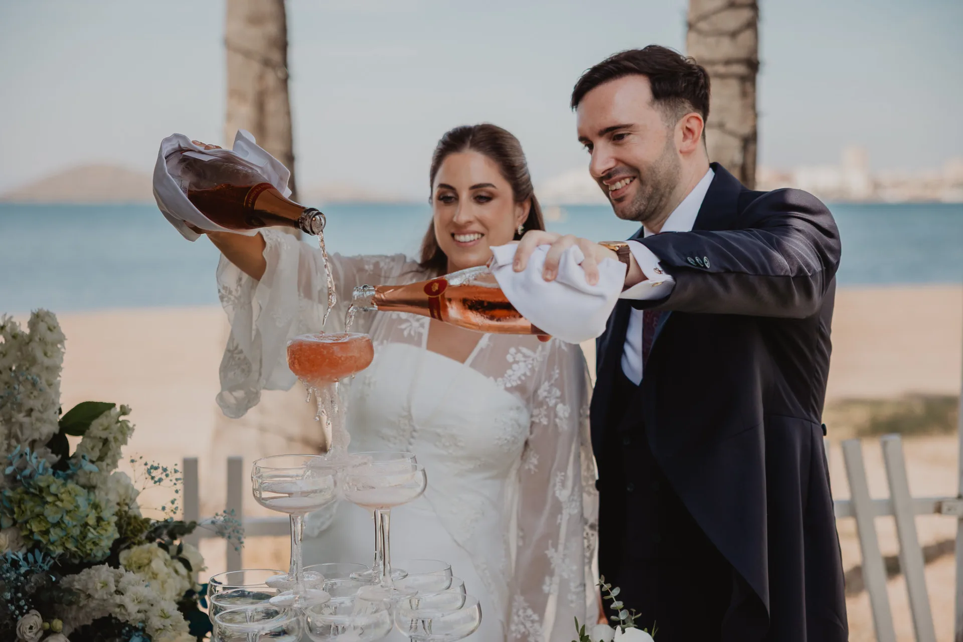 Después de la ceremonia, el convite se trasladó al restaurante Maloca, a pie de mar. Entrada de los novios con torre de copas, un cóctel animado y lleno de pequeños manjares, y una decoración cuidada al milímetro: la paleta de colores jugaba con blancos, verdes y distintos tonos de azul, en sintonía con el entorno mediterráneo.